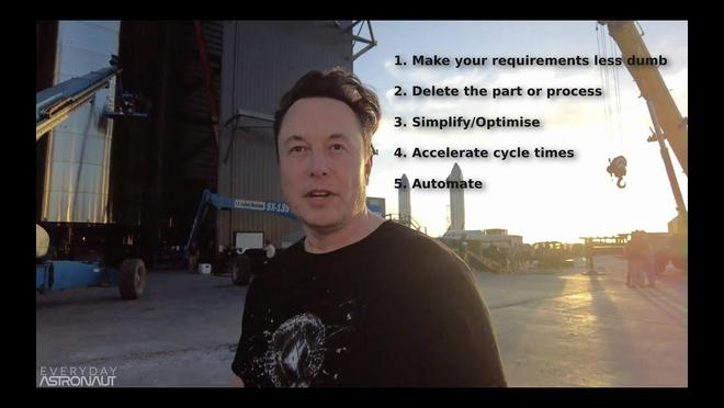 马斯克认为,每一个多出来的零件都是潜在的故障点,每一个多出来的流程都是对效率的损耗。