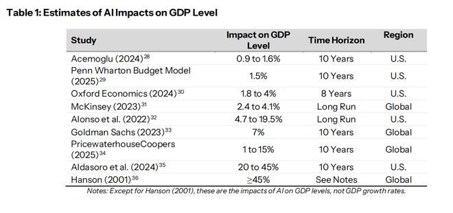 近期多项研究试图量化人工智能对GDP水平的影响。这些研究的估算结果差异很大:人工智能可能使美国GDP增长1%到45%以上。如此大的范围反映了人工智能经济特征的高度不确定性。但值得注意的是,仅2025年上半年,人工智能相关投资就使GDP年化增长率提高了1.3%,让人联想到工业革命时期铁路投资的规模,这似乎排除了最低的几种估算。