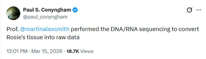 根据保罗在X平台发布的帖文:Martin Smith博士进行了DNA/RNA测序,将Rosie的生物组织转化为可分析的原始数据,Palli Thordarson教授则带领团队完成mRNA疫苗的设计与组装。Palli Thordarson教授本人也在社交平台上证实了这一点,并表示:“RNA技术、基因组学与AI的交汇,为医学实践带来了改变的可能,也让医疗更加公平。”
