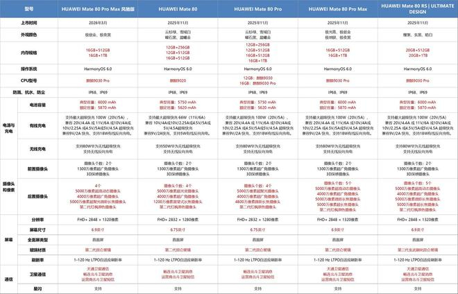 华为 Mate 80 系列手机配置差异一图知: