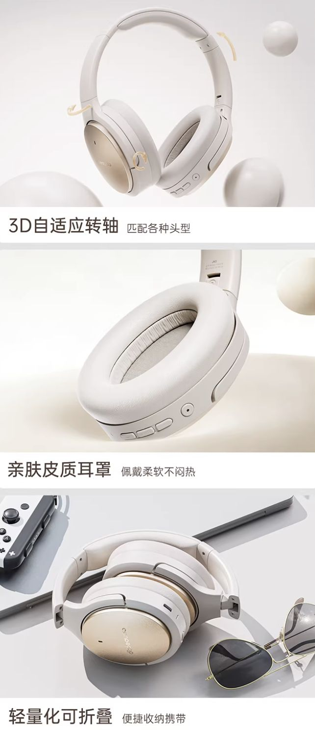 该耳机整体采用可旋转折叠设计,提供亲肤皮质耳罩,配备 40mm 动圈,支持降噪及空间音频功能,耳机搭载蓝牙 6.0 技术,支持 LDAC 高清编码功能,耳机内置 1000mAh 电池,续航至高 115 小时。