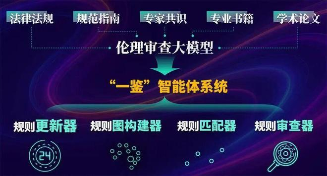 进入“ai for science”时代,人工智能等前沿科技能否反哺伦理治理,从而促成“科技与伦理治理”的携手共进,已然成为值得探索的新议题。2023年起,王国豫带领学生与姜育刚、马兴军和生命科学学院杨亚军团队合作,着手开展伦理审查大模型的训练。经过近2年的努力,“一鉴”大模型应运而生。基于高质量伦理审查数据微调的专用大模型,“一鉴”集成了规则更新器、规则图构建器、规则匹配器和规则审查器四大核心模块,能够定期自动抓取、提炼最新政策法规,构建分层分领域的伦理规则知识图谱,并针对待审查的项目资料高效精准匹配相关规则。