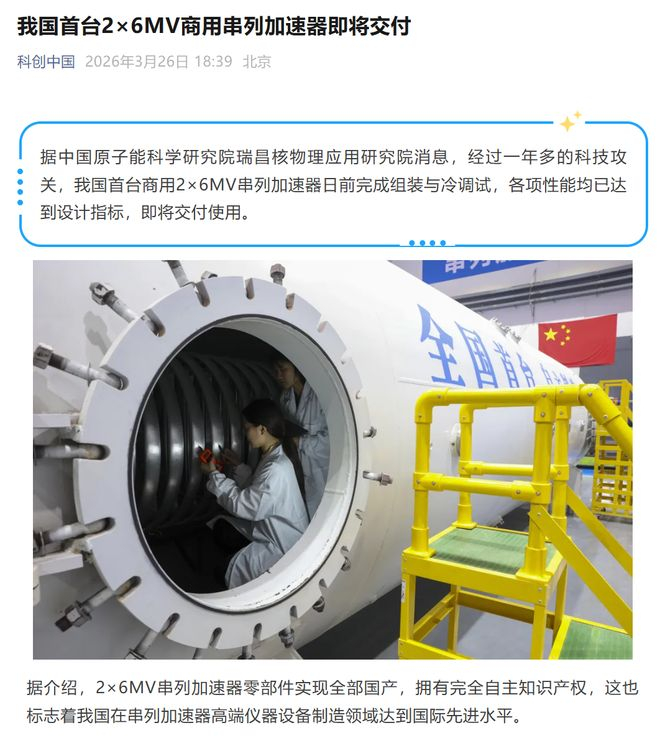 IT之家 3 月 29 日消息,综合央视新闻、“科创中国”公众号消息,我国首台商用 2x6MV(IT之家注:12 兆伏)串列加速器日前在江西瑞昌核物理应用研究院加速器研发中心完成组装、冷调试,关键性能指标达到设计要求,正式完成生产下线,标志着国产高端科研装备取得阶段性进展。