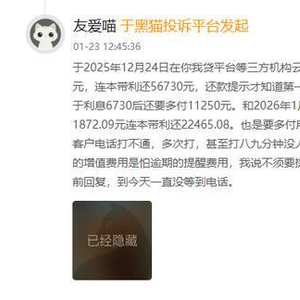 黑猫平台有投诉称,用户分别在某平台借款5万元和1.98万元,分12期还款时发现,平台在未提前告知的情况下,额外收取了高额“增值服务费”(5万元借款多收11250元、1.98万元借款多收4455元)。如若投诉细节属实,在捆绑收费的情况下这两笔交易的综合年化成本超过40%。