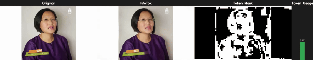 以下展示了 InfoTok 在不同场景下生成的 Token 掩码。每个动图中:左侧为原始视频,中间为 InfoTok 的重建视频(亮区表示高信息量区域,被分配了 Token;暗区表示低信息量区域,信息被压缩到其他 Token 中),右侧柱状图显示每帧的 Token 使用率。