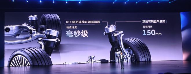 悬挂系统配备了双腔空气弹簧与 DCC 无级可调减振器,支持车身高度与阻尼硬度的毫秒级自适应调节。其空气悬架的最大调节行程达到 150mm(支持向上升高 80mm 以提升通过性,或向下降低 70mm 以方便乘员上下车)。