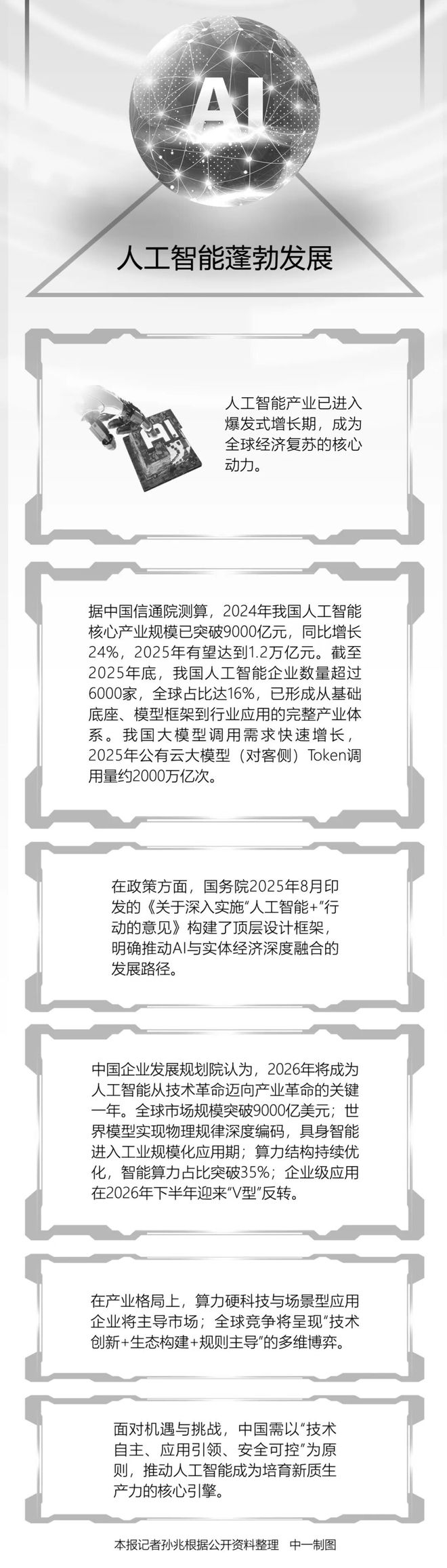 中国信息通信研究院发布《人工智能产业发展研究报告(2025年)》(以下简称“报告”)。据中国信通院测算,2024年我国人工智能核心产业规模已突破9000亿元,同比增长24%,2025年有望达到1.2万亿元。截至2025年底,我国人工智能企业数量超过6000家,全球占比达16%,已形成从基础底座、模型框架到行业应用的完整产业体系。我国大模型调用需求快速增长,2025年公有云大模型(对客侧)Token调用量约2000万亿次。人工智能正加速从“能思考”向“能实干”转变,为千行百业开拓赋能新空间。