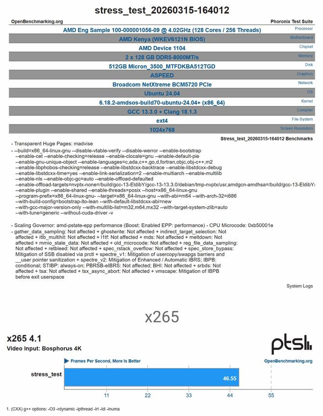 另一个单路 Kenya 平台则搭载 128 核 256 线程样片,配备两根 128GB 高速内存,主要运行了 x265 视频编码测试。