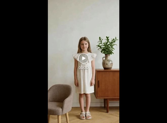 提示词:A woman stands indoors, speaking to the camera. She begins by picking up a vase from a cabinet, then gazes at it contemplatively, and finally places it on a chair within the scene. (Keep the character fully in frame throughout.)