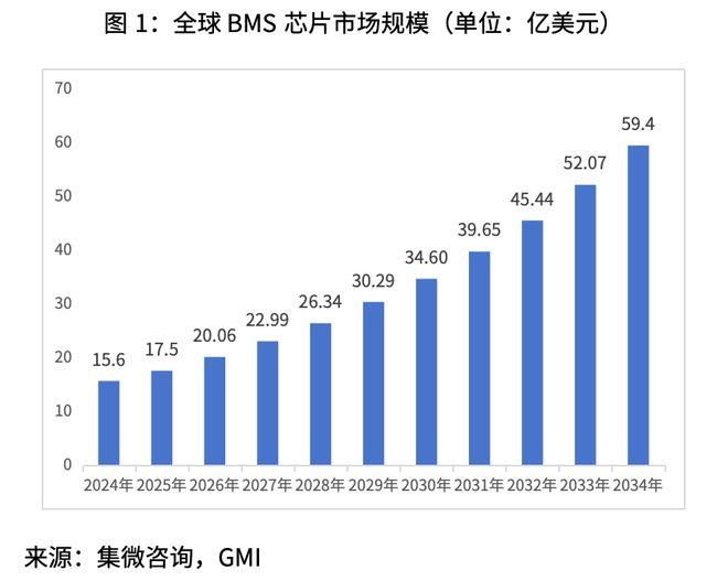 根据Global Market Insights Inc.数据,2024年全球电动汽车电池管理(BMS)芯片市场规模为15.6亿美元,2025年增长为17.5亿美元,且该市场2034年预计达到59.4亿美元,复合年增长率为14.6%。