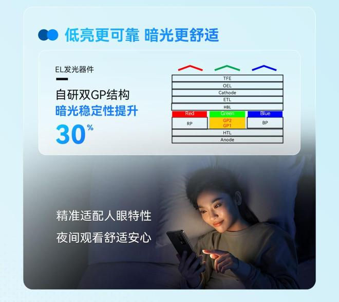 U9 Pro 基材在 EL 电致发光器件的绿色部分采用了自研的双 GP 结构,暗光稳定性较上一代提升 30%,能够精准适配人眼在不同光线下的敏感特性,夜间观看也能舒适安心。