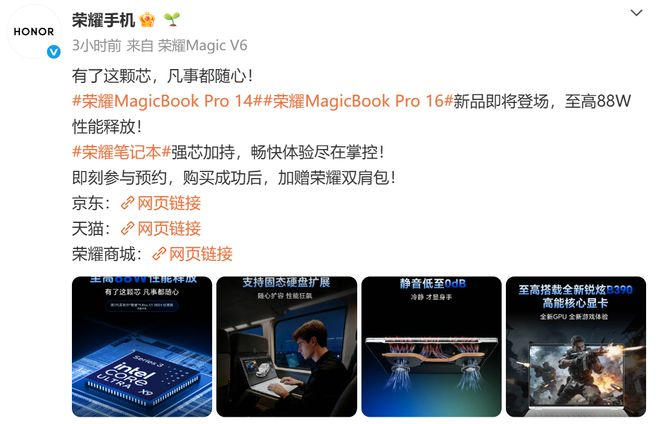 而在性能方面,官方数据显示,荣耀 MagicBook Pro 16 2026 至高搭载英特尔酷睿 X9-388H 处理器,锐炫 B390 核显,最大性能释放 88W,在全新智冷散热加持下,静音低至 0db。
