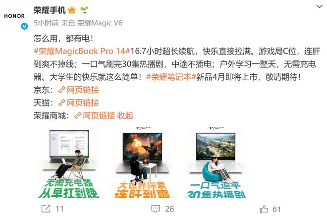 荣耀官方释放的续航预热海报显示,荣耀 MagicBook Pro 14 2026 最新续航时长达到了 16.7 小时,无论是追剧、游戏、学习,用户无需再为电量焦虑。