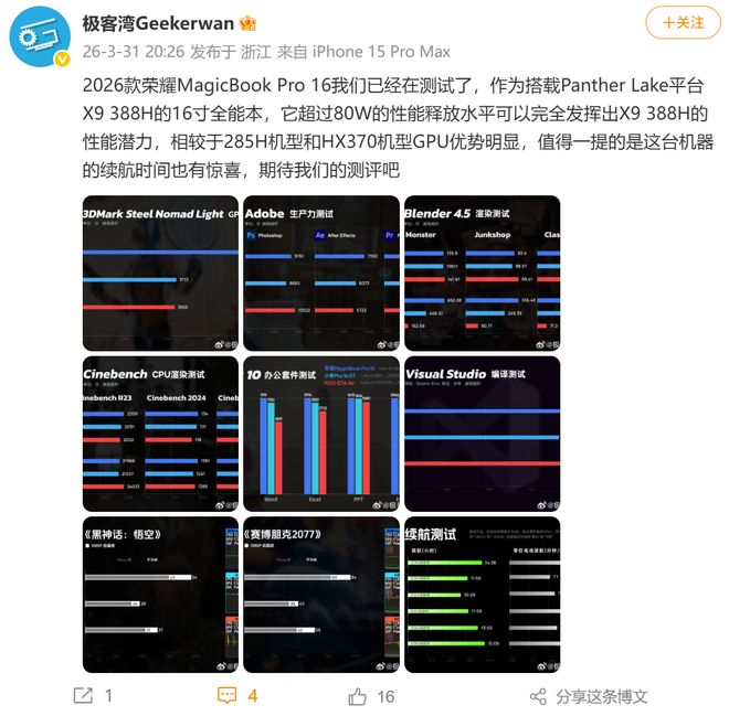 3 月 31 日,随着各大科技媒体实测数据的陆续放出,2026 款荣耀 MagicBook Pro 系列的表现再次引发行业关注。经媒体实测,荣耀 MagicBook Pro 14 2026 续航实测超越 MacBook Pro;荣耀 MagicBook Pro 16 2026 拥有超过 80W 的性能释放水平,可以完全发挥出 X9 388H 的性能潜力。实测数据的出炉,进一步验证了荣耀 MagicBook Pro 系列 16.7 小时超长续航、至高 88W 性能释放的硬核实力。
