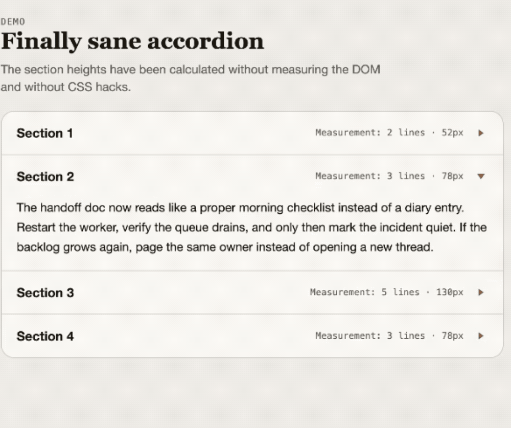 那些常见的自动增高输入框、折叠面板、多行文本居中、纯Canvas多行文本,以及其他过去在CSS里给网页排版、布置样式等非常棘手的难题,如今都变得简单到不值一提。