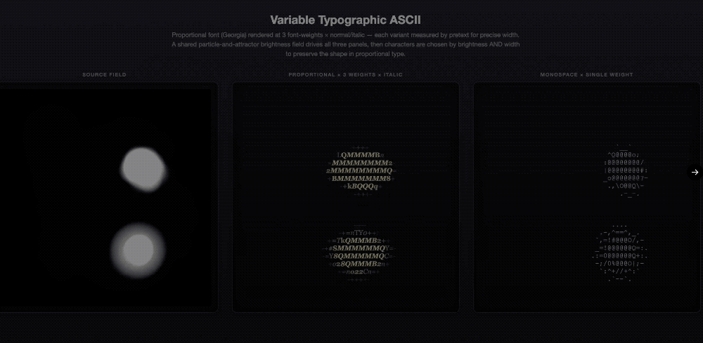 Pretext还能快速制作可变字体宽度的ASCII字符画,也就是只包含英文字母、数字、标点符号、少量符号等基础符号拼出图案、人脸、风景、logo等字符画。
