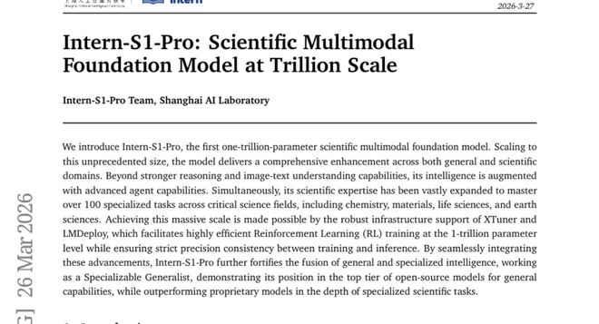 这项由上海AI实验室主导的突破性研究发表于2026年3月27日,论文编号为arXiv:2603.25040v1,研究团队首次构建了拥有万亿参数规模的科学多模态基础模型Intern-S1-Pro。这个庞大的AI系统不仅在通用能力上达到了业界顶尖水平,更是在科学专业领域展现出了前所未有的深度理解能力。