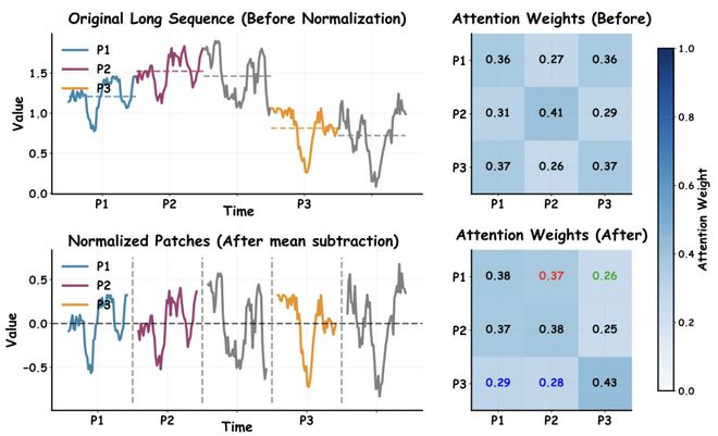 PMD 的核心操作简洁而高效:对每个 Patch 减去其时间均值,将原始 Patch 分解为长期趋势(均值)和残差形状两部分。与现有 Normalization 方法不同,PMD 仅做均值减法,完整保留了 Patch 内部的振幅变化和形状结构。