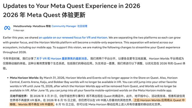 上周 Meta 宣布,Horizon Worlds(地平线世界)将在 Quest VR 头显上彻底下架。