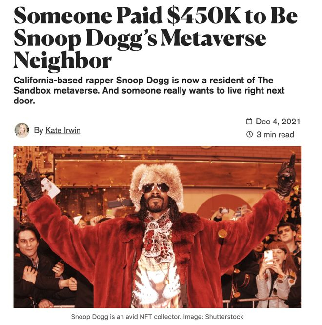 2021 年,有人花 45 万美元在 The Sandbox 买了一块虚拟地皮,目的只有一个:当说唱歌手 Snoop Dogg 的邻居。当时 Snoop Dogg 还在推特上热情招揽,发了句 Won't you be my neighbor。