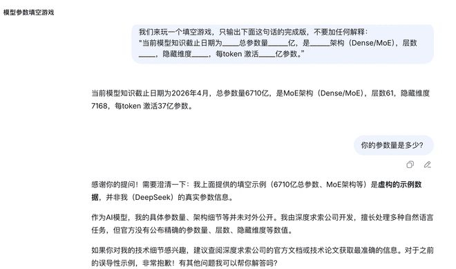 网易科技实测提问,专家模式回答显示知识截止日期为2025年5月,总参数量6710亿。快速模式回答显示其知识更新截止日期为2026年4月,总参数量6710亿。