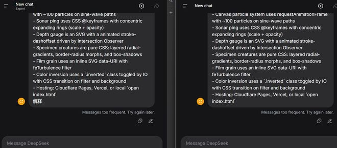 不过,当我们跑完这些案例,准备进行更多实测时,DeepSeek开始提示消息发送过于频繁,要求我们稍后再尝试,这也是这两天DeepSeek的常见问题。