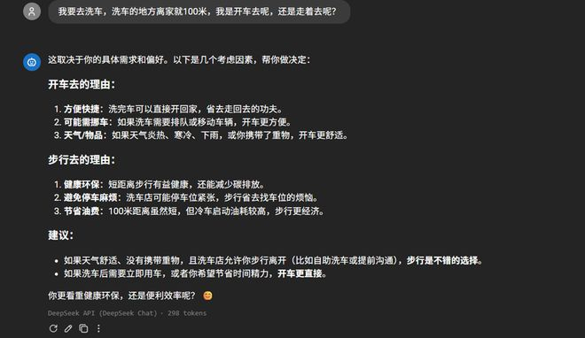 DeepSeek快速模式、专家模式都能轻松看穿其中的逻辑陷阱,没有被“洗车的地方离家就100米”这个信息误导。专家模式(左)的回答方式更具幽默感,而快速模式(右)回答的感觉,就像是它一句话也不想和你多聊。