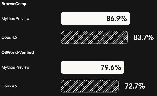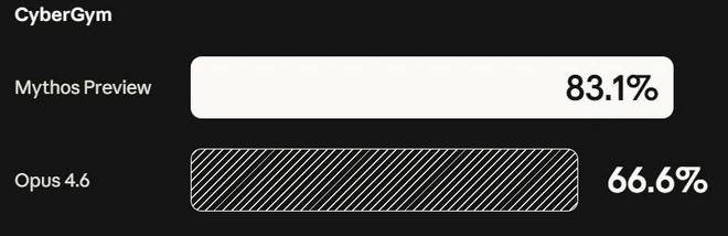 在衡量网络安全漏洞复现能力的 CyberGym 测试中,Claude Mythos Preview 的得分为 83.1%,而 Opus 4.6 仅为 66.6%。这种接近 20 个百分点的提升,证明了新模型在理解复杂系统状态和执行精准安全操作方面的巨大进步。
