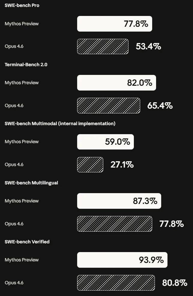 为了量化 Claude Mythos Preview 的能力,Anthropic 公布了一系列详尽的基准测试结果,并将其与之前的旗舰模型 Claude Opus 4.6 进行了直接对比。无论是在网络安全专用的测试环境,还是在综合性的编程和逻辑推理基准中,新模型都取得了显著的领先。