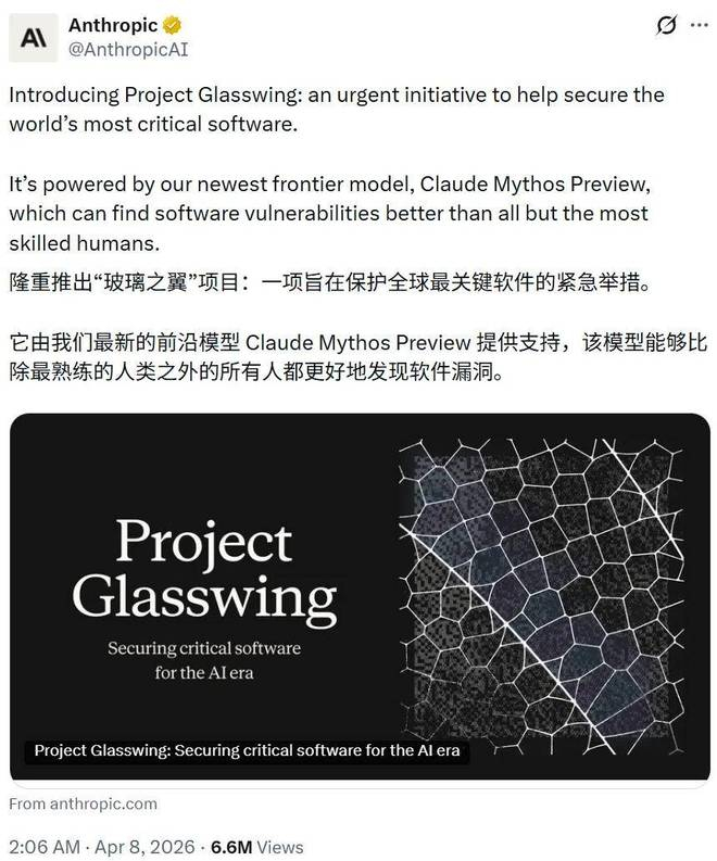 今天凌晨,Anthropic 发布了大量关于其新模型Claude Mythos Preview的信息(包含一份长达 244 页的系统卡)。同时,Anthropic 还宣布了一个基于此模型的 AI 网络安全项目Project Glasswing