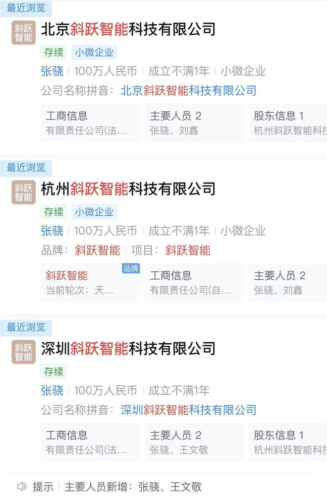 天眼查显示,斜跃智能在上述三地分别注册成立了北京斜跃智能科技有限公司、杭州斜跃智能科技有限公司、深圳斜跃智能科技有限公司,三家公司法定代表人均为张骁,注册资本均为100万元。