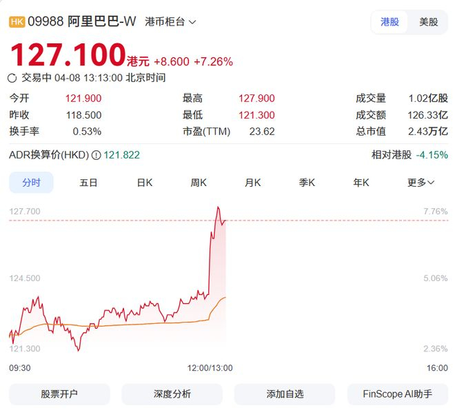 阿里巴巴港股大涨7% 市场资讯 04.08 13:27 (来源:三言科技)4月8日消息,阿里巴巴港股午间大涨7.26%,截至发稿,港股每股达127.1港元,总市值达2.43万亿港元,较昨日收盘价118.5港元上涨8.6港元。