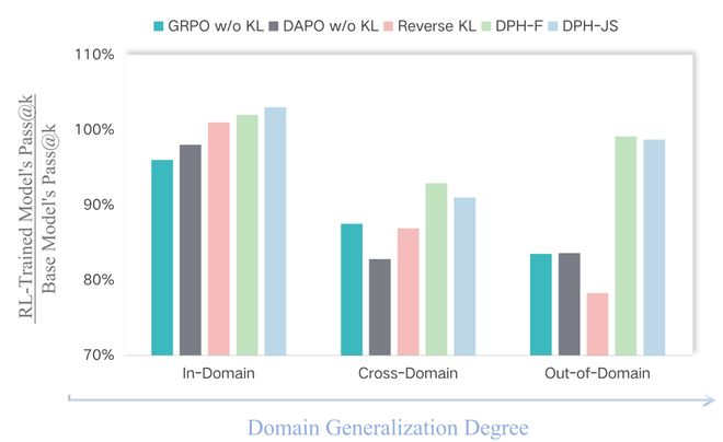 实验表明,DPH-RL不仅能缓解Pass@k下降问题,还可同时提升Pass@1,并在跨域任务上展现出更优的稳定性与泛化能力。更重要的是,这一结果启示我们:在RL后训练时代,保住多样性与提高奖励同等重要。