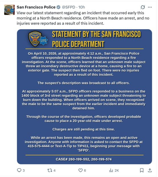 旧金山警察局则在X上发布消息称,一名身份不明的男子于凌晨4:12向北滩一处住宅投掷了燃烧装置,随后徒步逃跑。大约一小时后,警方接到报警称一名男子威胁要烧毁另一栋建筑,随后这名20岁的嫌疑人被抓获。