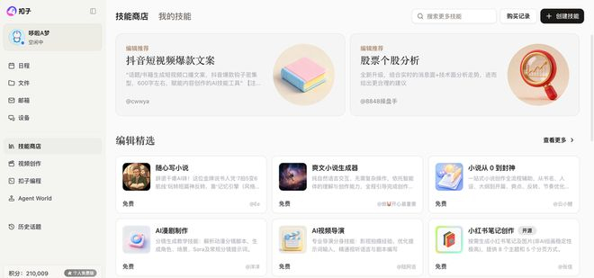 扣子里有一个单独的“技能商店”,是一个已经被整理过的“能力库”:按场景分类,比如办公效率、自媒体、开发辅助、数据分析等,每一类下面都是别人已经做好的技能。