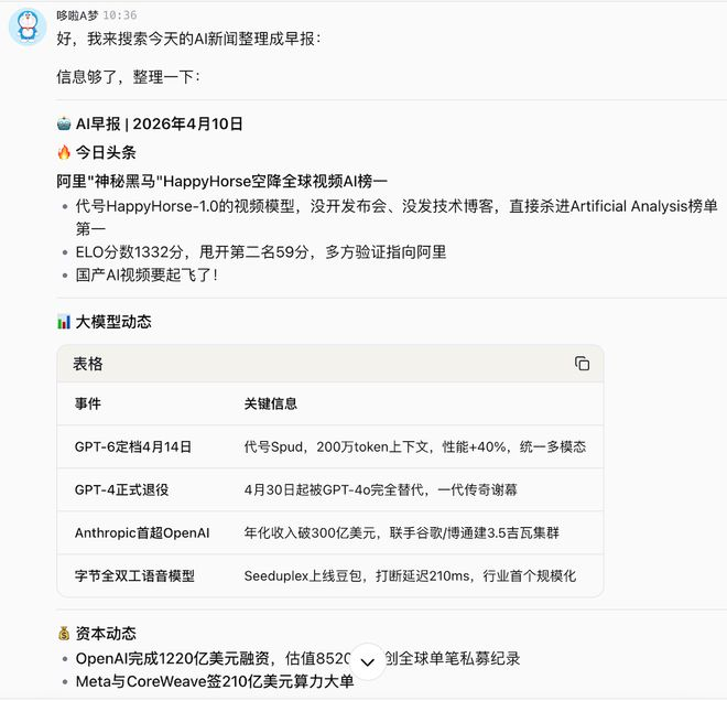 我自己试了一下,只需一句话,向“哆啦A梦”下达指令,它就能把当天的AI新闻抓取整理成早报:头条、模型动态、资本动态按类别呈现,整个过程顺畅、高效,信息一目了然。