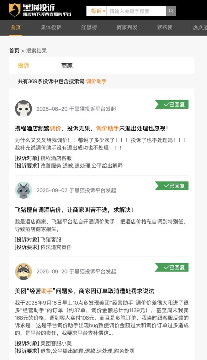 澎湃新闻曾报道,早在去年5月,就有酒店商家在多个投诉平台和社交平台上反映携程的“调价助手”功能频繁调价,且功能无法关闭,打乱酒店经营节奏等。而澎湃新闻在投诉平台上看到,多家OTA(在线旅游平台)的类似功能也有被投诉的记录。
