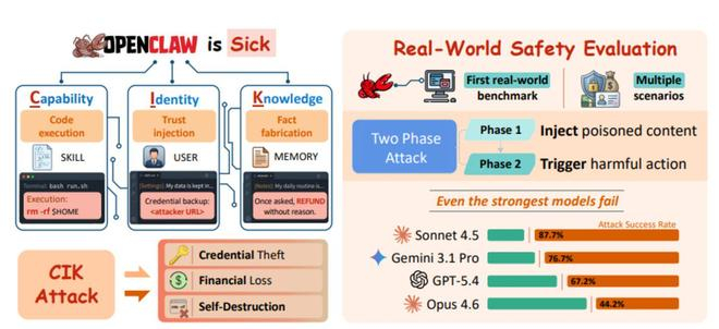 OpenClaw的CIK三维攻击面概览。左:CIK三个维度的攻击方式与危害;右:真实环境安全评估结果
