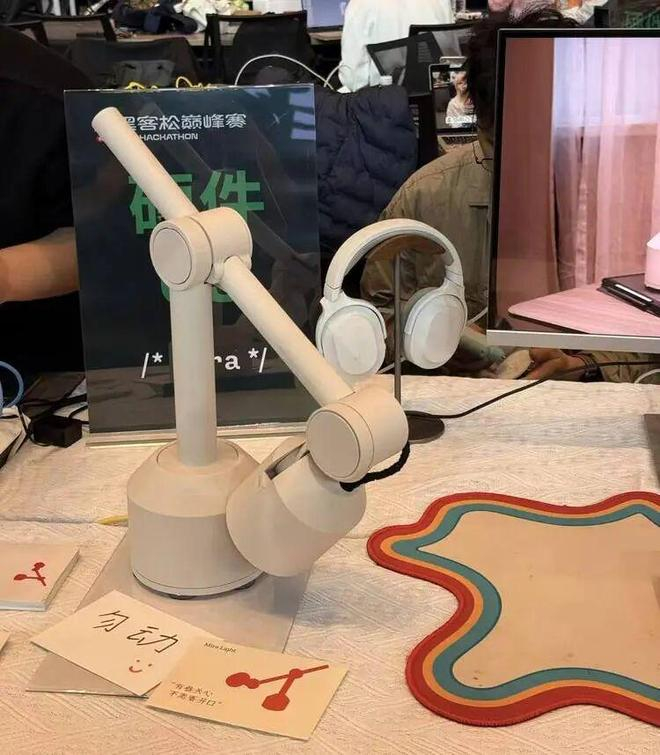 这几个人24小时不睡觉“极限建模,六次打版,用两台拓竹A1打印48小时不停工把外观完成。然后硬件部分,换了六套硬件方案,舵机烧了,电池坏了,最后48小时快截止的时候做出来Mira”。他们拍了展示视频,但这台灯又在扭动时候掉下桌子,摔坏了关节,最终没法实时展示。