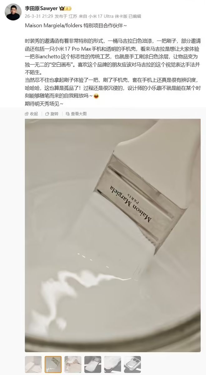 此前,小米汽车工业设计总经理、首席设计师李田原在今年 3 月底曾透露过小米和 Maison Margiela / folders 的特别项目合作,并晒出了小米 17 Pro Max的定制设计壳。