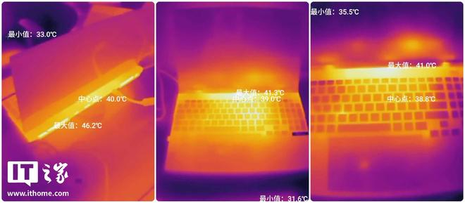 另外,双烤测试中,机身表面最高温度仅为 41°C,键盘区域手感是温热状态,但远谈不上烫手。最高温集中在机身后面的出风口区域,达到了 46°C。