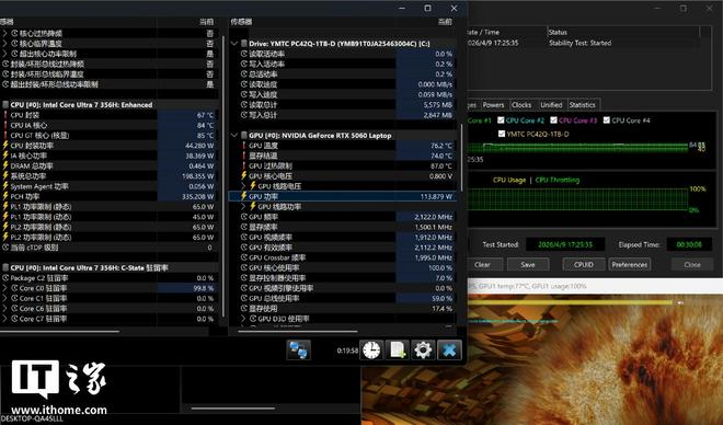 当然这一峰值状态并未持续太久,在后续 30 分钟的稳定运行中,CPU 功耗稳定在 45W、温度 91℃,GPU 则持续保持 115W 功耗、73℃ 温度,整机合计性能释放稳定在 160W,且全程无波动、无降频,实现了长时间满血输出。对于一款主打轻量化的轻薄游戏本而言,这样的性能释放与稳定性表现堪称出色。