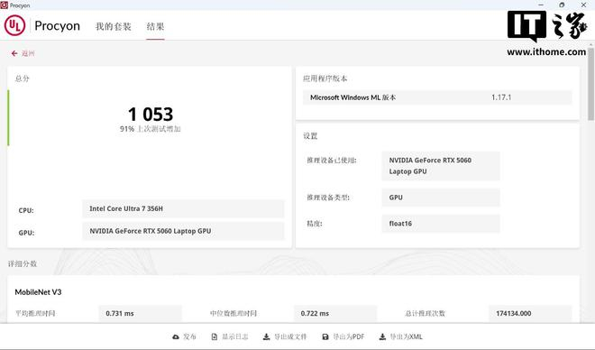 AI 部分,IT之家通过 Procyon 中的 AI Computer Vision Benchmark 项目,对 AI 推理性能进行测试。这里使用 Windows ML 引擎、精度 Float32,选择 GPU 进行测试,最终得分为 552 分。在 Float16 精度的测试中,分数来到了 1053。