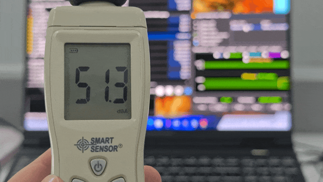 如下图所示,双烤属于极端满载场景,风扇已处于全速运转状态,此时机身人位噪音约 51dB,对比办公室约 45dB 的环境音,能明显听到风扇运转,声音大小接近桌面小风扇最高档位。