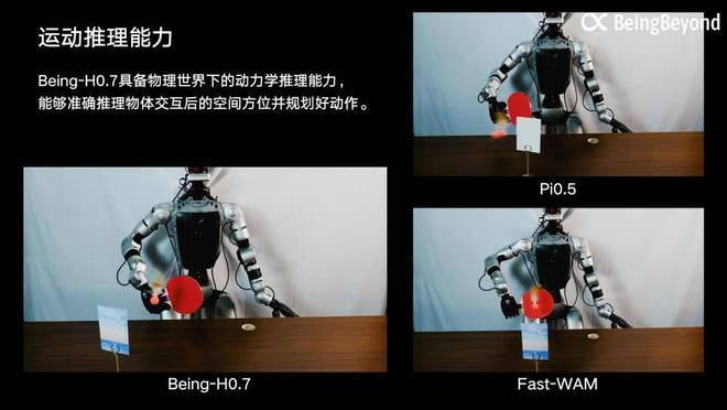 另外一个强大的优势则是推理速度的显著提升,是 Fast-WAM 的 11 倍,是 imagine-then-execute 这类生成式世界模型的 40 倍以上,Being-H0.7是世界上第一个能够在端侧设备上实时稳定部署的世界模型。强大的推理能力赋予了 H0.7 对于外界动态快速的感知能力,能完成如判断滑落小球轨迹、高速流水线包装、液体准确倾倒等这些之前 VLA、世界模型都难以胜任的任务。