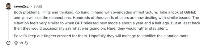 这两大问题也就是额度限制和思考能力下降都与基础设施过载密切相关,去GitHub上看看就知道了,成千上万的用户现在都在面临类似的问题,这情况感觉就像一年半前GPT发布新模型时一样。