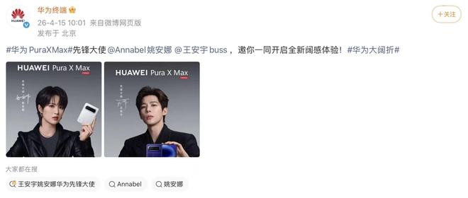 4月15日,华为终端正式官宣,姚安娜与王安宇将共同出任华为Pura X Max的先锋大使。