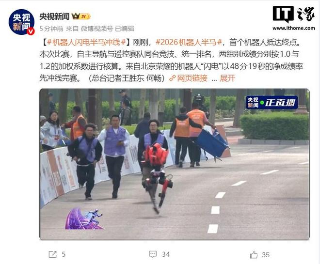 据央视新闻报道,北京荣耀机器人“闪电”以 48 分 19 秒的净成绩率先冲线完赛。