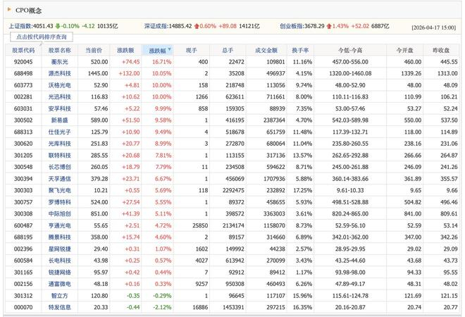 进入2026年二季度,AI算力基建持续升级,光电合封(CPO)作为破解数据中心带宽瓶颈、降低功耗的核心技术,正迎来从概念炒作转向规模化落地、业绩集中兑现的关键拐点。截至4月中旬,全球头部封测厂、硅光平台、光模块龙头、光芯片与器件厂商密集发布量产计划、样品验证、订单落地与业绩预增公告,叠加台积电硅光平台量产、英伟达AI工厂架构落地、海外光器件龙头产能告急等多重催化,CPO板块已成为半导体与光通信领域景气度最高的赛道之一。
