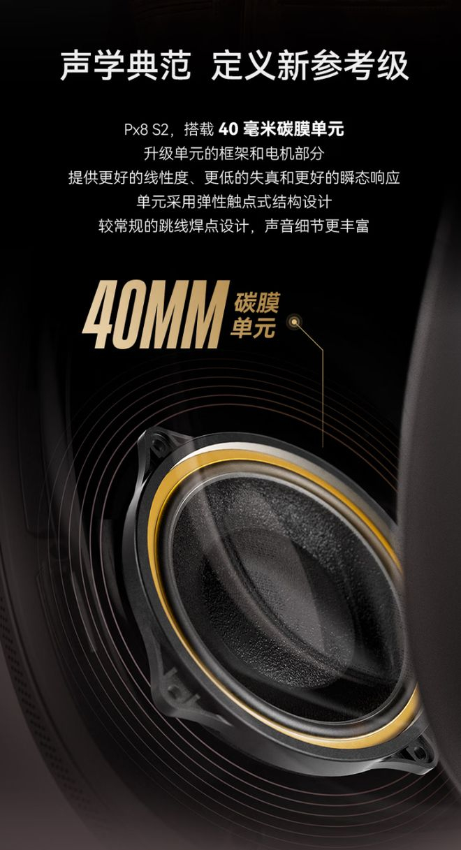 规格方面,这款耳机延续了初代 Px8 的 40mm 碳膜单元,但配备了全新驱动架构,引入了全新 DSP 及放大单元,优化音质表现和失真,支持 aptX Adaptive(24-bit / 96 kHz)和 aptX Lossless,后续将 OTA 加入 LC3 与 Auracast 编码器。